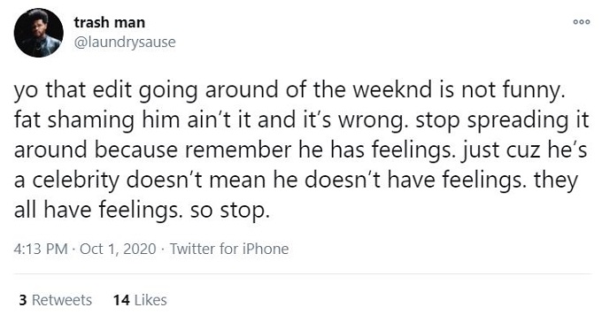 Earlier today, The Weeknd appeared to react to the fat-shaming Twitter meme with the tweet below: